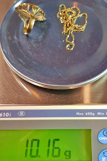 순금, 18킬로그램이 들어간 큰 색상의 보석이 박혀 있는 칵테일 일반지에서는 금 중량보다 매입할 수 없는 스톤이 더 많은 경우가 있습니다. 그래서 세팅된 큰 스톤 반지는 분리를 먼저 하고 매입 가격을 안내해 드립니다. 분리 과정에서는 반지를 잘라내야 하는 경우가 많으므로 미리 안내하고 진행합니다. 반지와 목걸이는 18킬로그램이 확인되어 약 10.1그램으로 매입 가격이 결정되었습니다.
