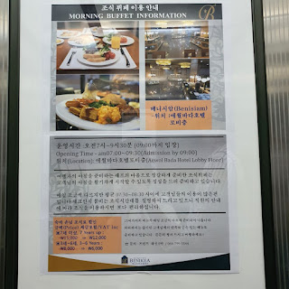 요하의 스탭들이 오셜 자판기 마스크, 일회용 슬리퍼, 세안 용품 세트, 생리대, 면도기 등 다양하게 있습니다! 엘리베이터에 부착된 안내문 조식에 대한 내용으로 우리는 숙박 앱으로 예약하면서 조식까지 먹을 수 있는 것으로 함께 결제한다!