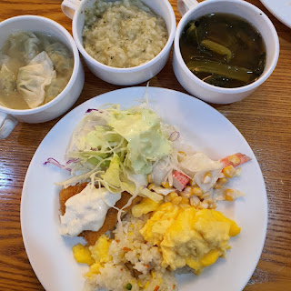 제가 좋아하는 물만두도 있고 아침에 먹기 좋은 죽빵, 스크램블 에그, 볶음밥, 생선튀김 등 크루아상이 맛있어서 두 개나 먹어치웠다. 우유도 있고 커피도 마실 수 있었다.